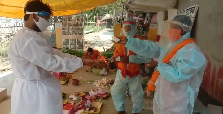 করোনাকালে ব্যতিক্রমী ঘটনা পশ্চিম মেদিনীপুরে, মাক্স পিপিই কিট পরে পারোলৌকিক প্রক্রিয়ার কাজ করলেন তিন পুরোহিত