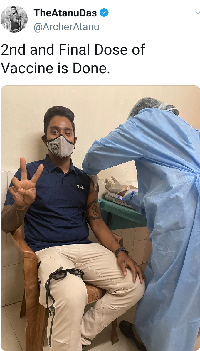 এখানে তীরন্দাজ ছাড়াও স্পোর্টস সাপোর্টারদের ও টিকা দেওয়া হয়। তারা করোনা সংক্রমণ আটকাতে দ্বিতীয় ডোজ নিলেন। দ্বিতীয় ডোজ নিয়েছেন ভারতীয় তীরন্দাজ অতনু দাস। এদিন তিনি টুইট করে বলেন, শেষ হলো ভ্যাকসিন এর দ্বিতীয় ও চূড়ান্ত ডোজ নেওয়া। এই টিকা দানের কাজটি ভালো ভাবে সম্পন্ন করার জন্য ধন্যবাদ জানিয়েছেন আর্মি স্পোর্টস ইনস্টিটিউটকে। করোনার পর এই প্রথম সিনিয়র তিরন্দাজদের টুর্নামেন্ট। যে কারণে এখন তীরন্দাজের ব্যস্ত নিজেদের অনুশীলন ঝালাই করতে।