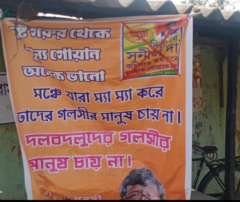 এবার সুনীল মণ্ডল কে প্রার্থী হিসেবে না চেয়ে পাল্টা পোস্টার দিল এলাকার মানুষ। শুক্রবার সকাল থেকেই সেই পোস্টার নজরে আসতে রীতিমতো এলাকার মানুষের মধ্যে জল্পনা শুরু হয়েছে। কে বা কারা এই পোস্টার সমর্থনে বা বিপক্ষে দিচ্ছে সেই নিয়ে উঠেছে প্রশ্ন। পোস্টারে লেখা হয়েছে দুষ্টু গরুর থেকে শূন্য গোয়াল অনেক ভালো। দল বদলুদের গলসীর মানুষ চায় না। তবে গোটা বিষয়টি বিজেপির গোষ্ঠীদ্বন্দ্ব বলে জানিয়েছেন বর্তমান সদরের তৃণমূলের জেলা সহ-সভাপতি মোঃ জাকির হোসেন।অন্যদিকে বিজেপির নেতা রমন শর্মা জানান আমাদের প্রার্থী কে হবে তা দল ঠিক করে আমরা নয় যেভাবে তৃণমূল থেকে সাড়ে সাড়ে নেতারা আমাদের দলে আসছে তাতে তৃণমূলের এই বিষয়ে কোনো মন্তব্য করা উচিত নয়।