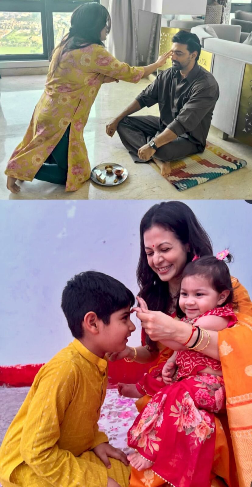 অন্যদিকে কোয়েল মল্লিক ভাগ করে নিয়েছেন মল্লিক পরিবারের ভাইফোঁটার রঙিন ছবি। তাঁর ছেলে কবীর ও মেয়ে কাব্য—এ বছরের ভাইফোঁটাতেই প্রথমবার অংশ নিল তারা। গোলাপি লেহেঙ্গায় কাব্য, আর হলুদ পাঞ্জাবিতে কবীর—দু’জনের ভাইবোনের স্নেহের সেই মুহূর্ত দেখে মুগ্ধ নেটিজেনরা। ছবিতে দেখা যাচ্ছে, কাব্যের কাছ থেকে ফোঁটা পেয়ে উচ্ছ্বসিত কবীর। পাশাপাশি, কোয়েলের কাকা রঞ্জিত মল্লিকও এদিন বোনের কাছ থেকে ফোঁটা নিয়েছেন।