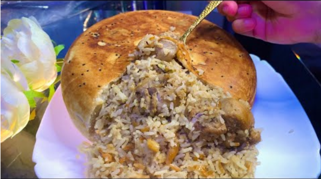 কিছুক্ষণ পরে আধসিদ্ধ করে রাখা চাল মিশিয়ে দিয়ে মিনিট দশেক বেশি আঁচে রান্না করুন। এ বার মটর/চানা (আধসিদ্ধ) মিশিয়ে দিন। কিছুক্ষণ পরে গ্যাস নিভিয়ে বিরিয়ানি রেখে দিন ঠান্ডা করতে। ময়দা বেলে নিন বড় আকারে, কিছুটা পুরু করে। স্টিলের গোল পাত্রে সাদা তেল মাখিয়ে ময়দার খোলস রেখে ভিতরে বিরিয়ানি ভরে মুখটা আটকে দিন। প্রি-হিট করা আভেন বা প্রেশার কুকারে বেক করে নিন মিনিট কুড়ি।