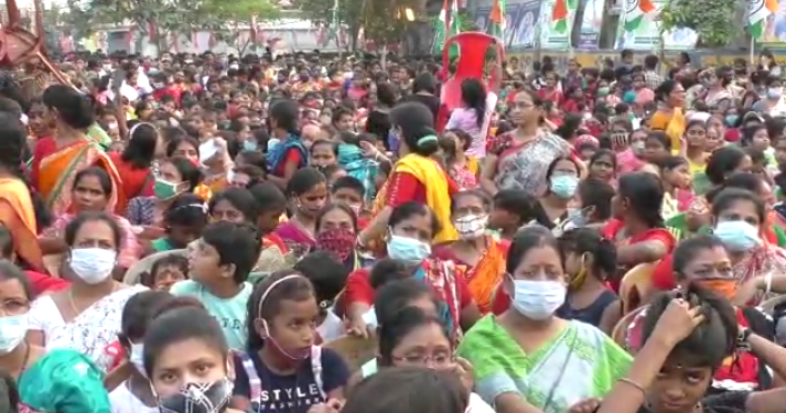 আজ সেই মাঠেই রাজারহাট নিউটাউন বিধানসভা কেন্দ্রের তৃণমূল কংগ্রেসের প্রার্থী তাপস চ্যাটার্জির সমর্থনে প্রচারে আসেন অভিনেতা সাংসদ দীপক অধিকারী(দেব)। অভিনেতা সাংসদ দেবকে দেখতে এই সভায় ছিল উপচে পড়া ভিড়। বেশির ভাগ মানুষের মুখে ছিল না মাস্ক। আর সেই কারণে মঞ্চে উঠে বক্তব্য রাখার প্রথমে সকলকে মাস্ক পড়ার অনুরোধ করেন দেব।