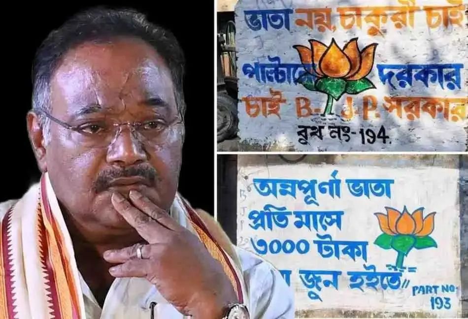 ভাতার-এর ১৯৩ নম্বর পার্টের দেওয়ালে বড় অক্ষরে লেখা, ‘অন্নপূর্ণা ভাণ্ডার প্রতি মাসে ৩ হাজার টাকা, ১ জুন হইতে।’ স্থানীয় বিজেপি নেতৃত্বের দাবি, ক্ষমতায় এলে ‘লক্ষ্মীর ভাণ্ডার’-এর নাম বদলে ‘অন্নপূর্ণা’ করে অর্থের পরিমাণ বাড়ানো হবে। অথচ ঠিক পাশের ১৯৪ নম্বর বুথের দেওয়ালে একই দলের কর্মীরাই লিখছেন, ‘ভাতা নয়, চাকরি চাই। পাল্টানো দরকার, চাই বিজেপি সরকার।’ এই বৈপরীত্য কি কেবল নির্বাচনী কৌশল, নাকি আদর্শগত বিভ্রান্তি— সেই প্রশ্ন উঠছে স্বাভাবিকভাবেই।
