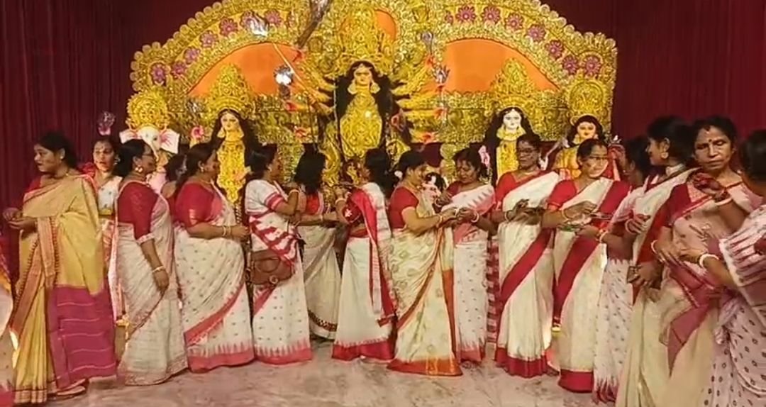 সকালে পূজা শেষে দেবীর চরণে সিঁদুর অর্পণ করেন পুজো কমিটির মহিলারা। এরপরই শুরু হয় সিঁদুর খেলার আনন্দ। বয়স নির্বিশেষে মা-মাসি, কাকিমা, বৌদিরা একে অপরের কপাল ও সিঁথিতে সিঁদুর লেপন করে মেতে ওঠেন মিলন উৎসবে।