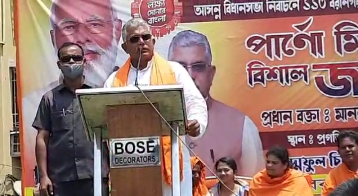 ২রা মে থেকে মমতা বন্দ্যোপাধ্যায়ের বিদায় শুরু হবে “মমতা বন্দ্যোপাধ্যায়ের ১০ বছরের কাজের প্রসঙ্গে এই ভাবেই মন্তব্য করলেন দিলীপ ঘোষ।বরানগরের প্রগতি সংঘের মাঠে বরানগরের বিজেপি প্রার্থী পার্নো মিত্রের সমর্থনে রবিবার সকালে সভা করলেন রাজ্য বিজেপি সভাপতি দিলীপ ঘোষ। তিনি এদিন বলেন “যে পরিবর্তন দিদি করেছেন সেটা বাংলার মানুষ চায়নি। উল্টে দিদি বাঙলার মানুষের গণতান্ত্রিক অধিকার ছিনিয়ে নিয়েছেন, শান্তি শৃঙ্খলা ছিনিয়ে নিয়েছেন। তাই মানুষ নিজেদের অধিকার ছিনিয়ে নিতে জয় শ্রী রাম ধ্বনী তুলে বাড়ি থেকে বেরিয়ে এসেছেন।”