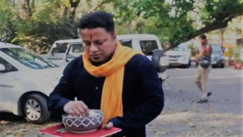 দিল্লির রাজপথে নেমে গুড়-বাতাসা বিলি করলেন বিজেপি নেতা অনুপম হাজরা।